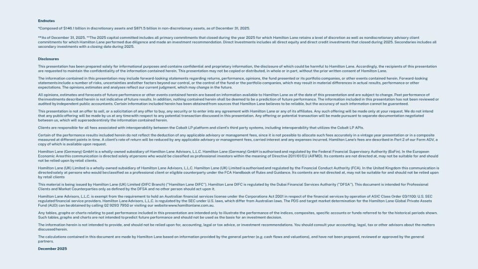All opinions, estimates and forecasts of future performance or other events contained herein are based on information available to Hamilton Lane as of the date of this presentation and are subject to change. Past performance of the investments described herein is not indicative of future results. In addition, nothing contained herein shall be deemed to be a prediction of future performance. The information included in this presentation has not been reviewed or audited by independent public accountants. Certain information included herein has been obtained from sources that Hamilton Lane believes to be reliable, but the accuracy of such information cannot be guaranteed.